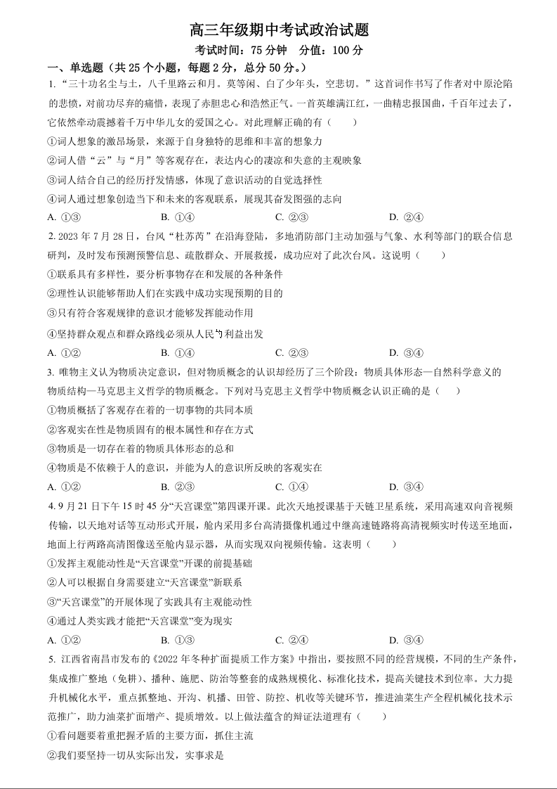河北省衡水市冀州中学2023-2024学年高三上学期期中考试 政治