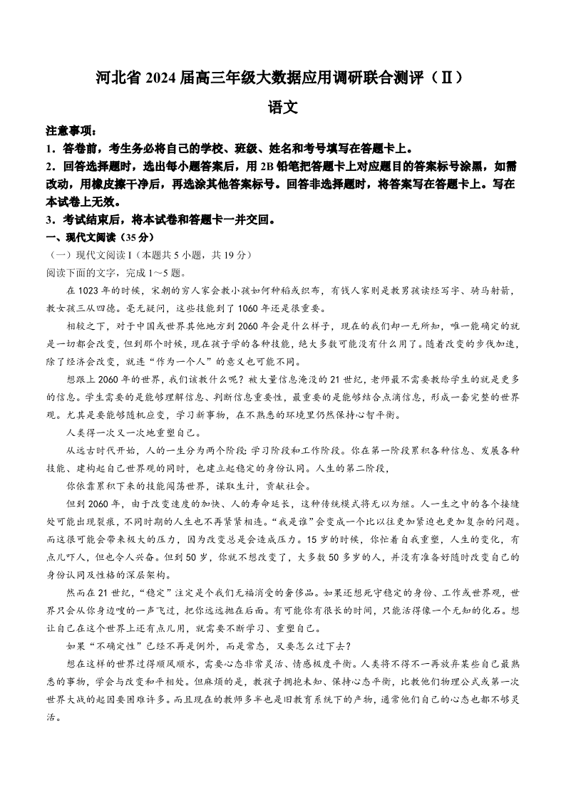 河北省2023-2024学年高三上学期大数据应用调研联合测评(Ⅱ)语文