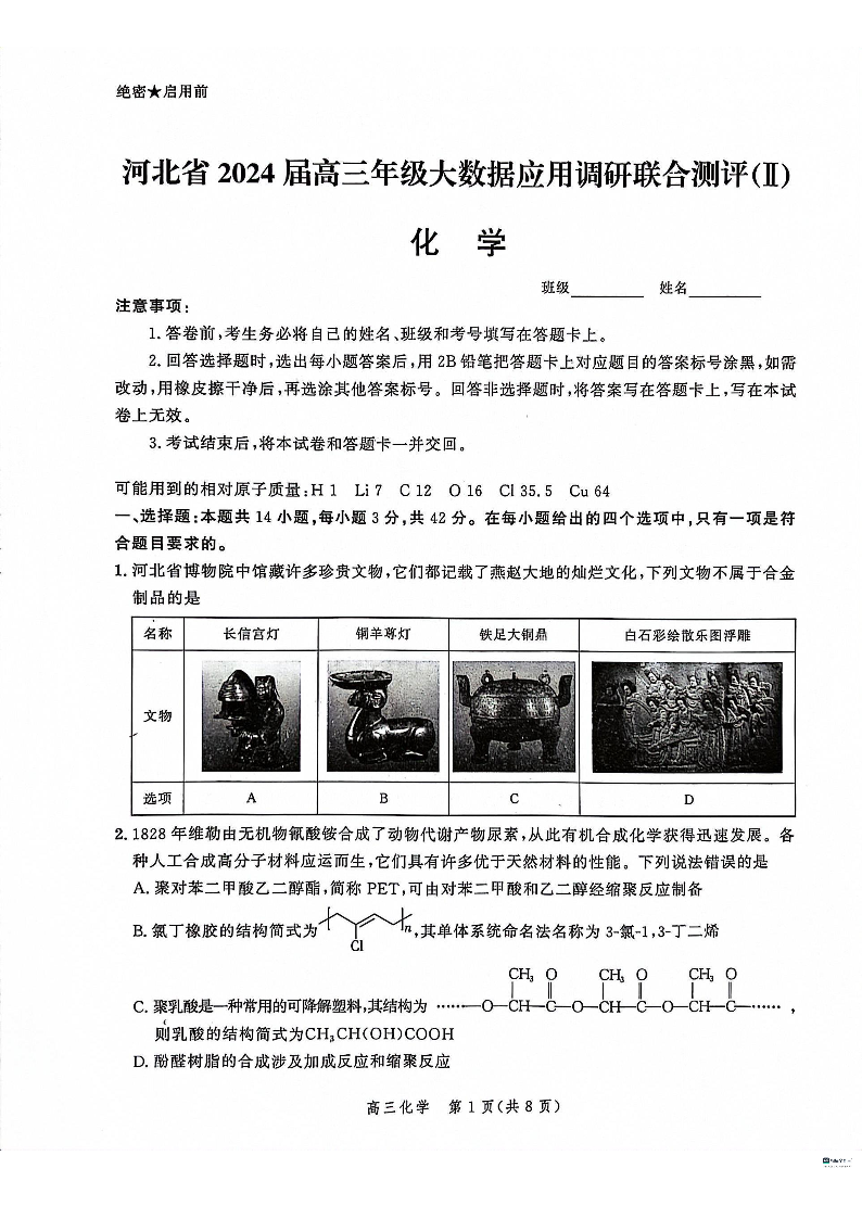 河北省2023-2024学年高三上学期大数据应用调研联合测评(Ⅱ)化学