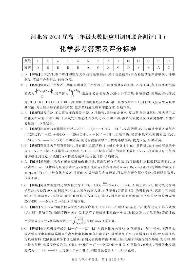 河北省2023-2024学年高三上学期大数据应用调研联合测评(Ⅱ)化学答案