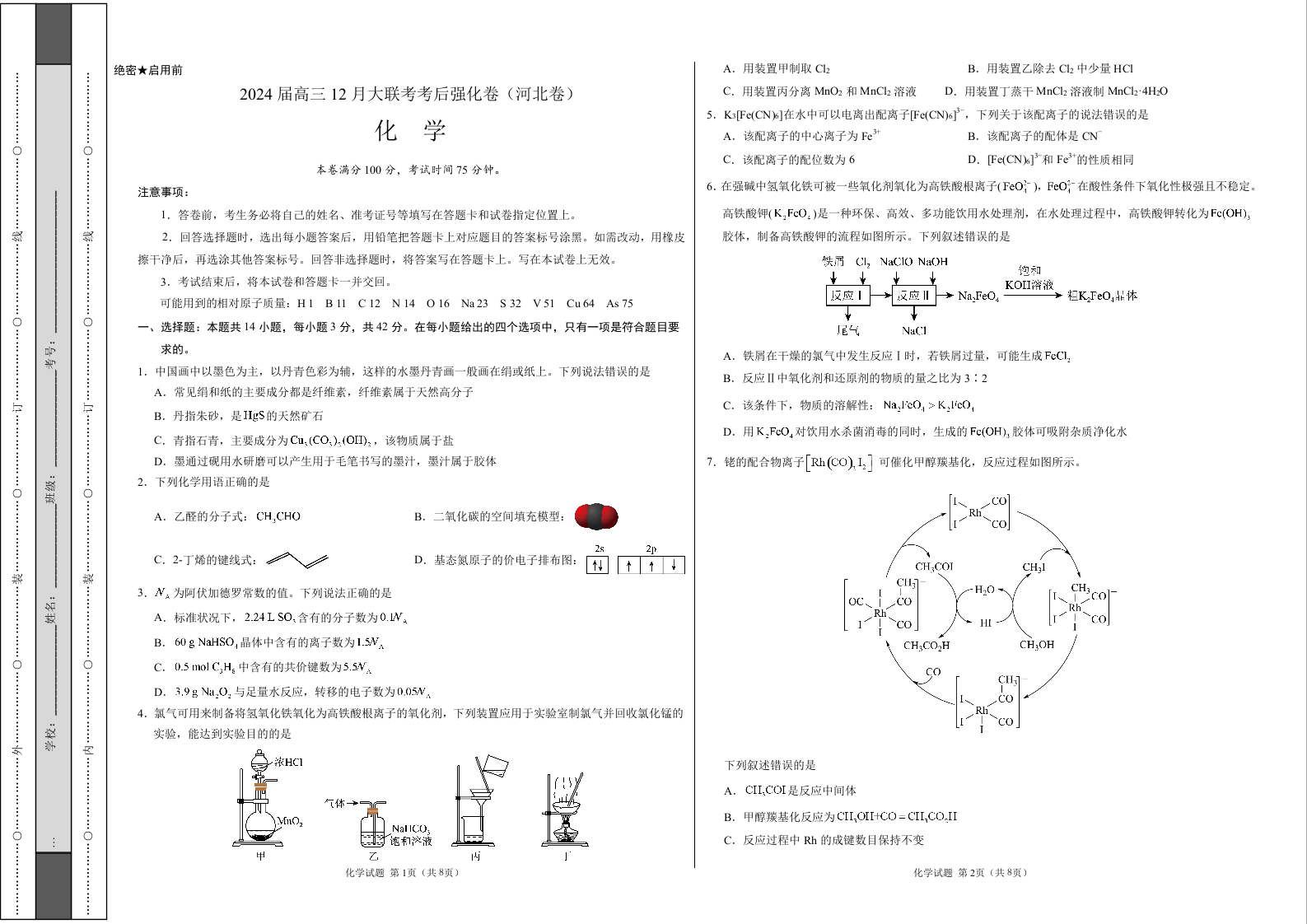 化学-2024届高三12月大联考考后强化卷(河北卷)(考试版)