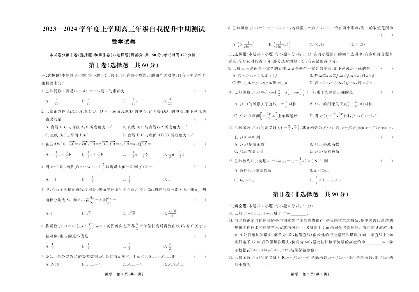 河北省承德市部分高中2023-2024学年高三上学期12月期中考试 数学