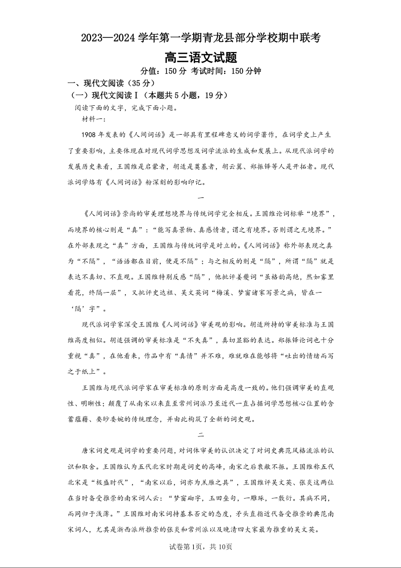 河北省秦皇岛市青龙县联考2023-2024学年高三上学期11月期中联考 语文