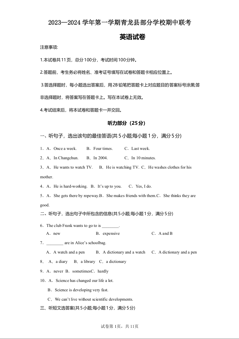 河北省秦皇岛市青龙县联考2023-2024学年高三上学期11月期中联考 英语
