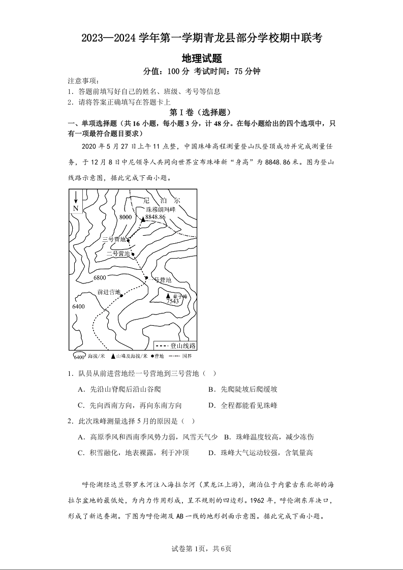 河北省秦皇岛市青龙县联考2023-2024学年高三上学期11月期中联考 地理
