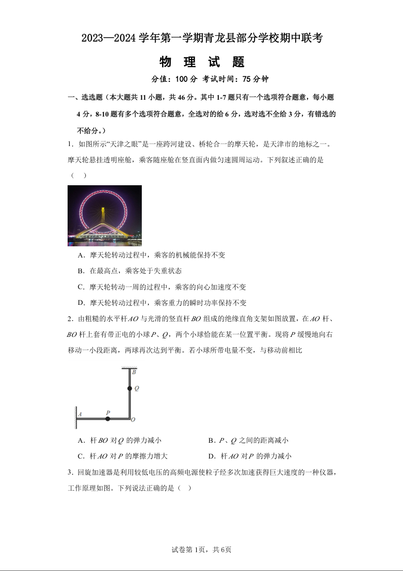 河北省秦皇岛市青龙县联考2023-2024学年高三上学期11月期中联考 物理