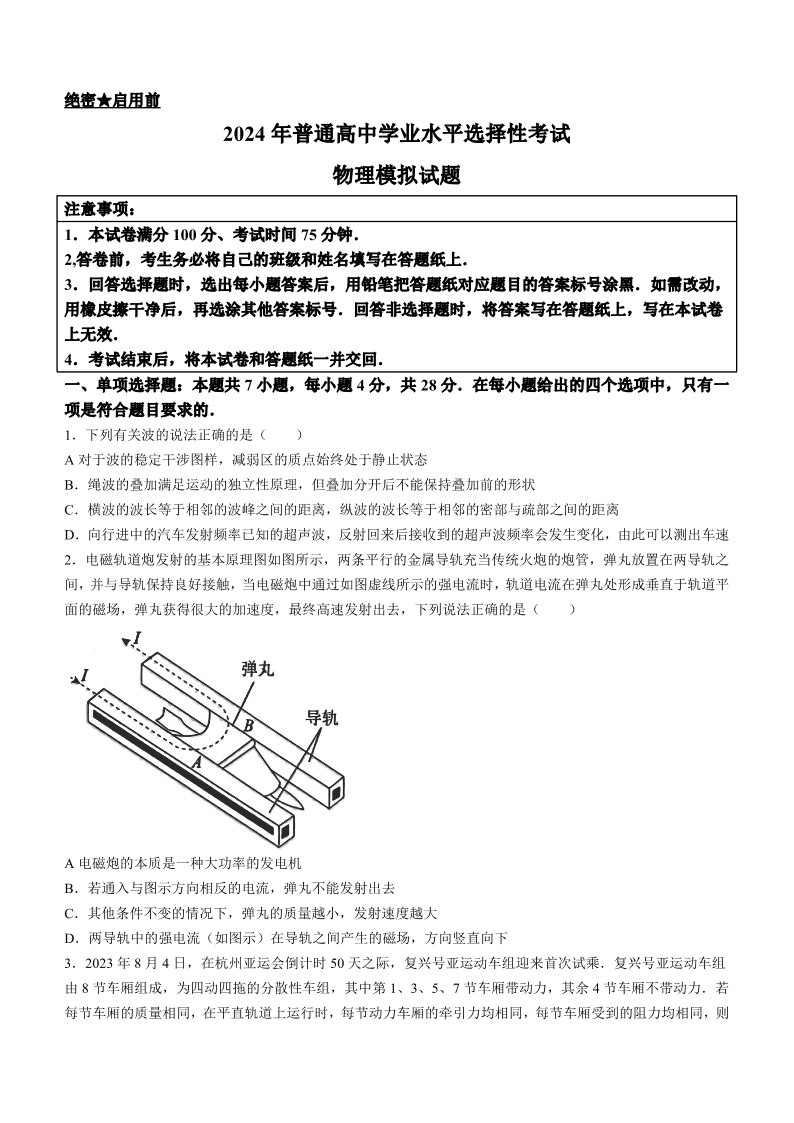 2024届河北省部分重点高中高三上学期学业水平选择性考试模拟 物理