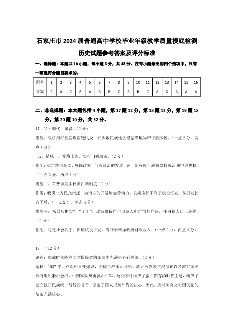 2024届河北省石家庄市普通高中学校毕业年级教学质量摸底检测 历史答案