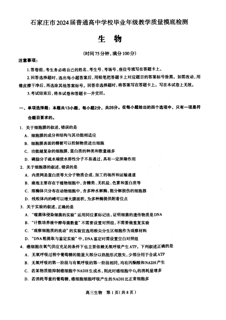 2024届河北省石家庄市普通高中学校毕业年级教学质量摸底检测 生物