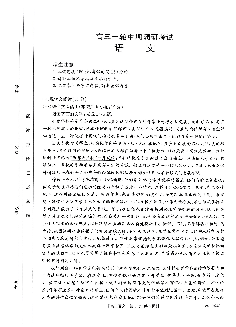 河北省廊坊2023-2024学年高三一轮中期调研考试 语文