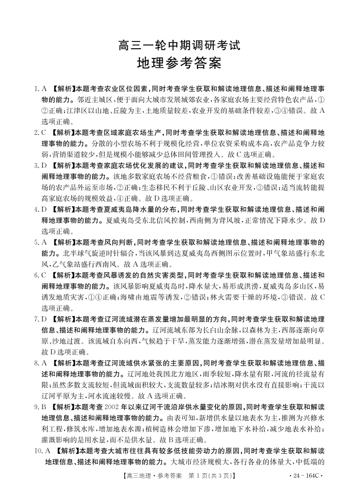 河北省廊坊2023-2024学年高三一轮中期调研考试 地理答案