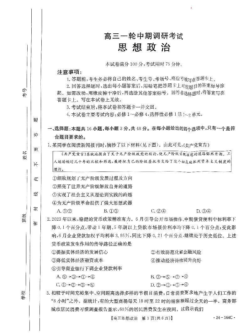 河北省廊坊2023-2024学年高三一轮中期调研考试 政治