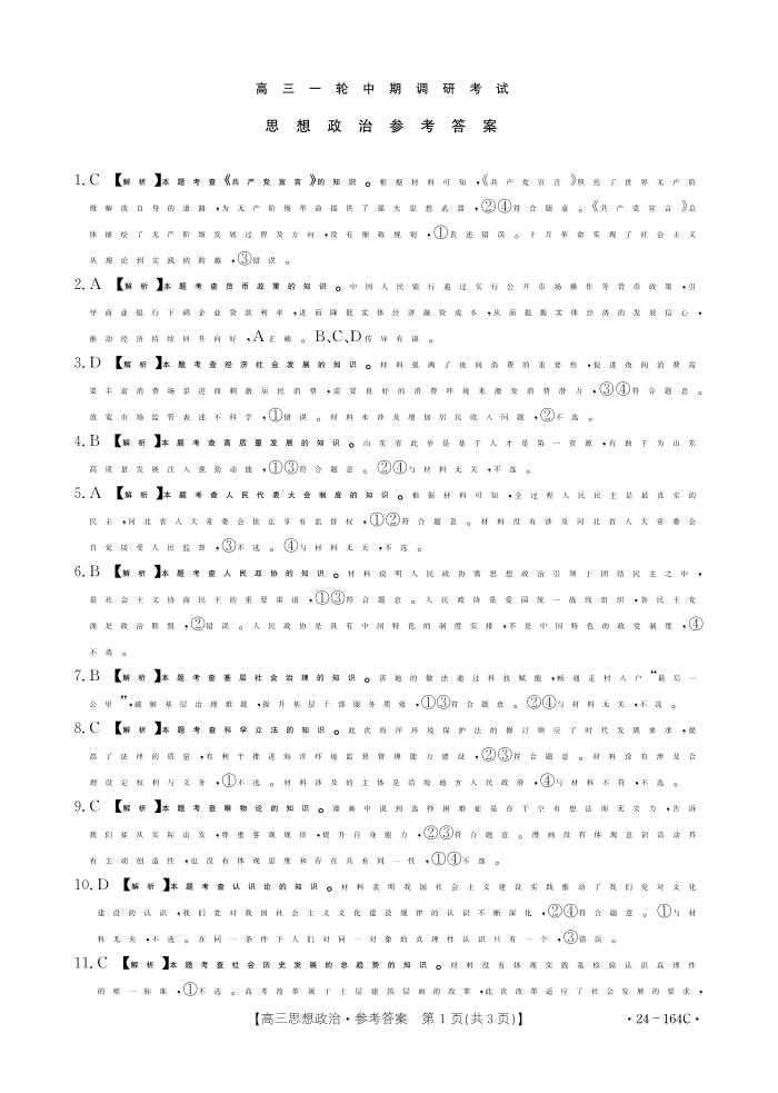 河北省廊坊2023-2024学年高三一轮中期调研考试 政治答案