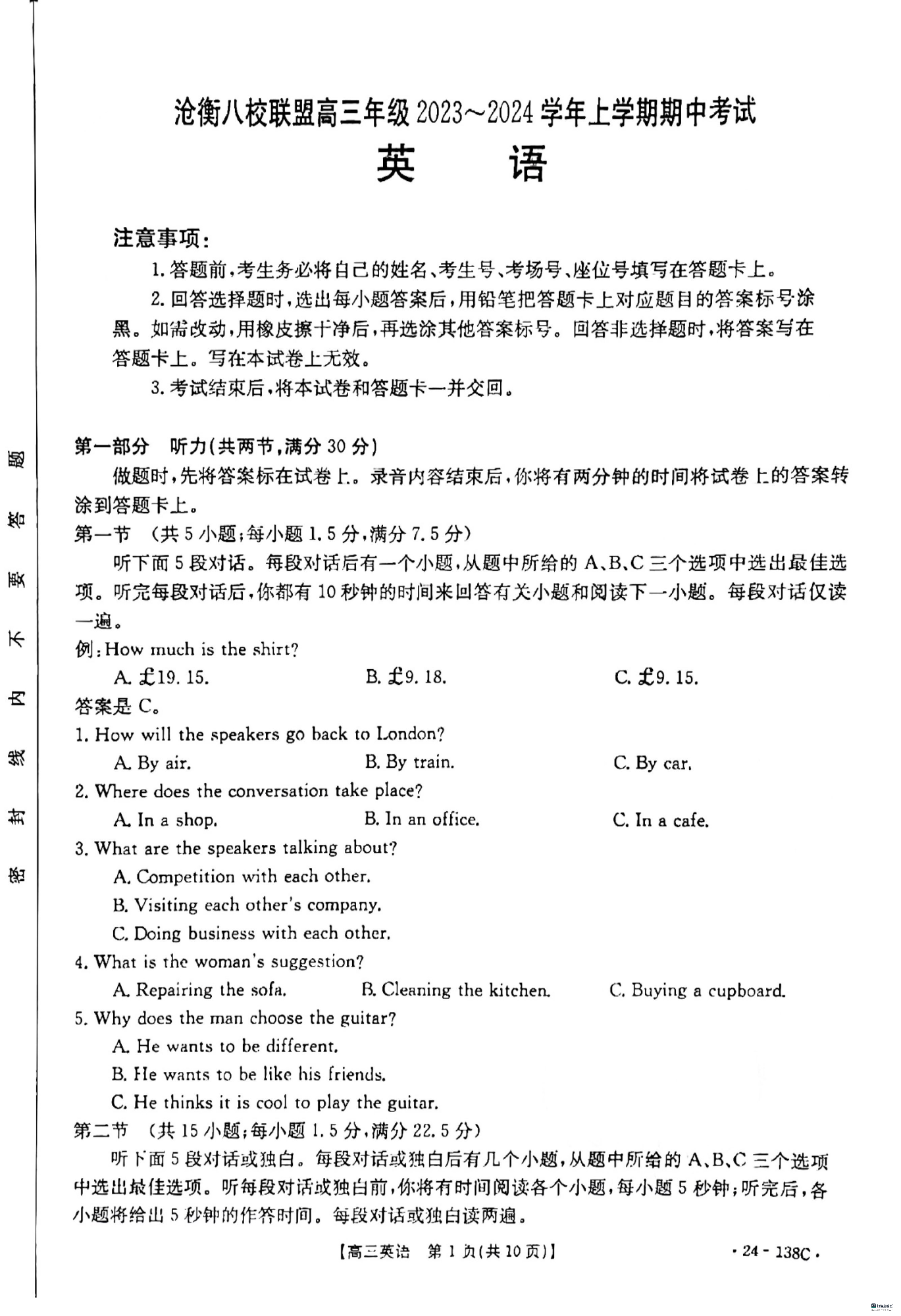 河北省沧衡八校联盟2023-2024学年高三上学期11月期中考试 英语