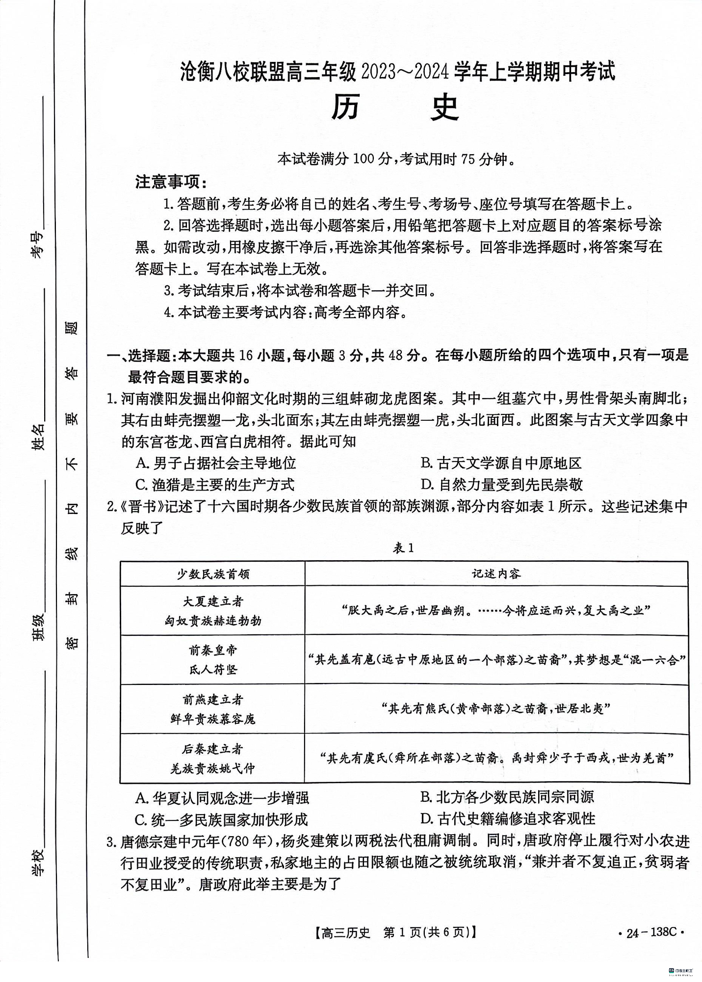 河北省沧衡八校联盟2023-2024学年高三上学期11月期中考试 历史