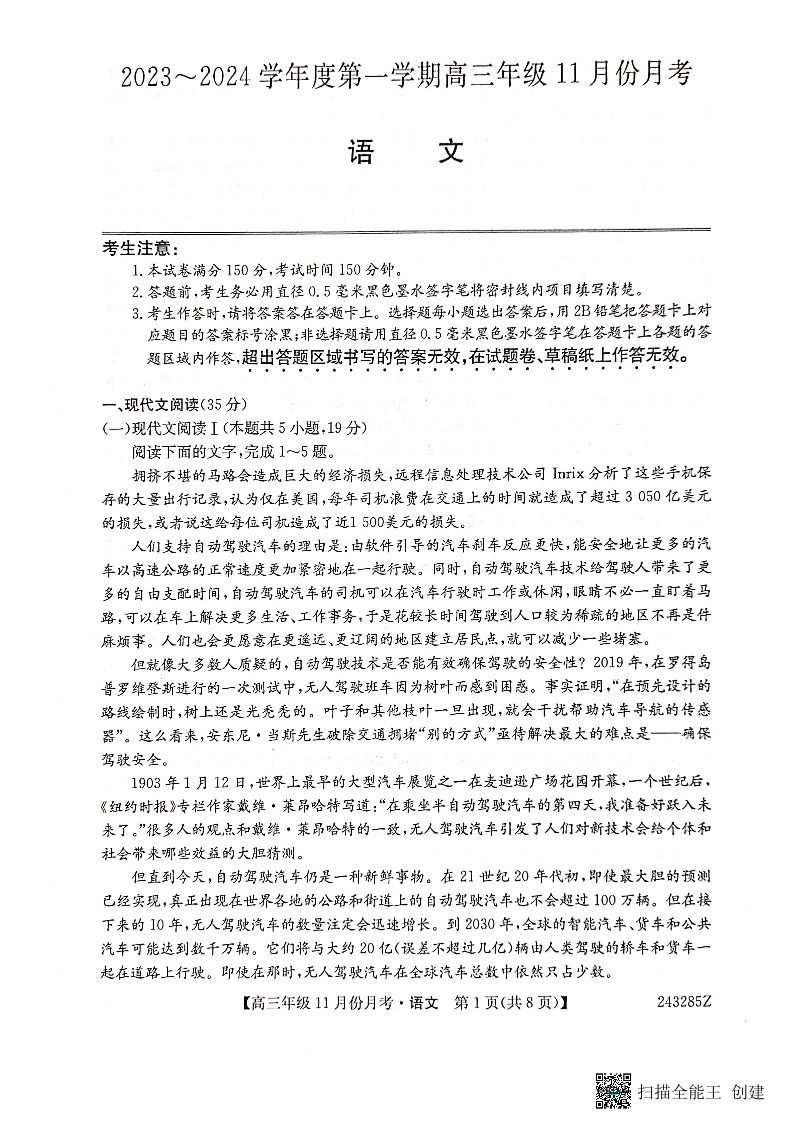 河北省沧州市东光县等三县联考2023-2024学年高三上学期11月月考 语文