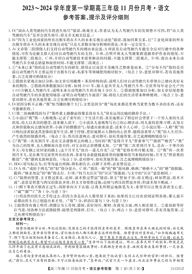 河北省沧州市东光县等三县联考2023-2024学年高三上学期11月月考 语文答案