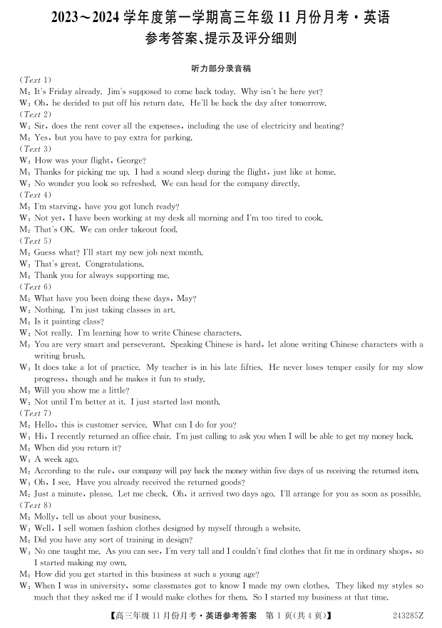 河北省沧州市东光县等三县联考2023-2024学年高三上学期11月月考 英语答案