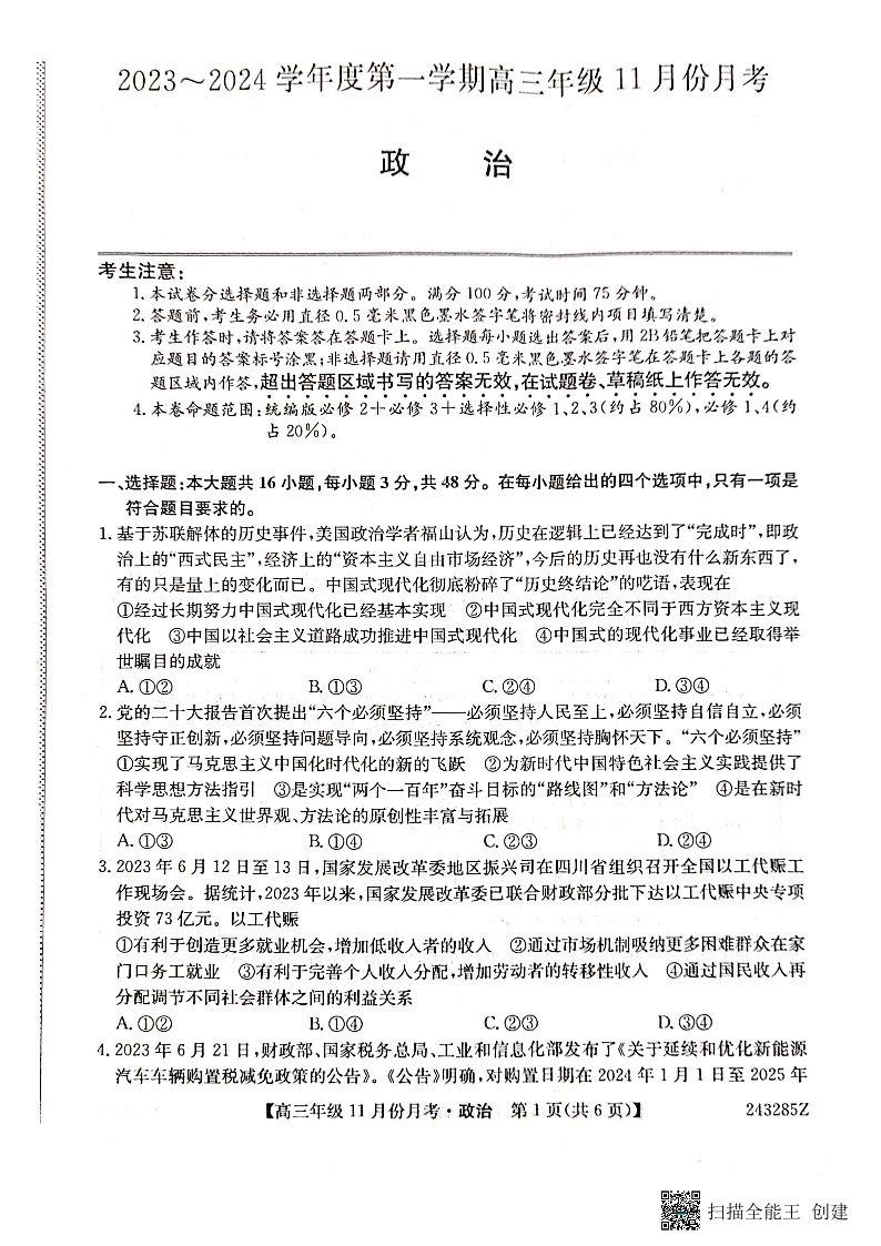 河北省沧州市东光县等三县联考2023-2024学年高三上学期11月月考 政治