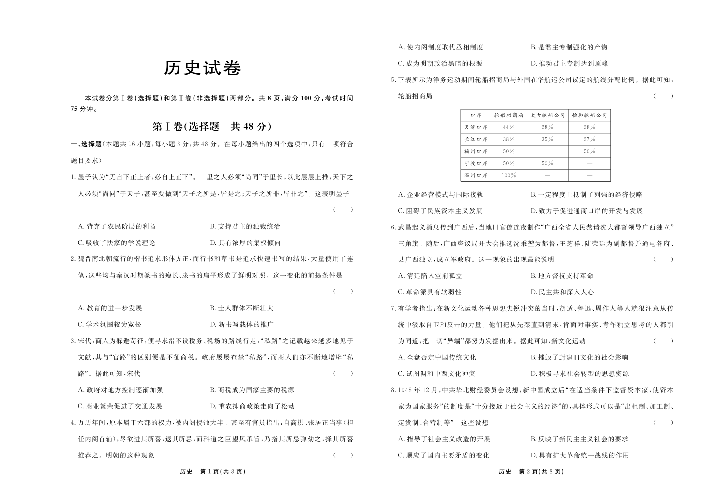 河北省沧州市部分高中2023-2024学年高三上学期11月期中考试 历史