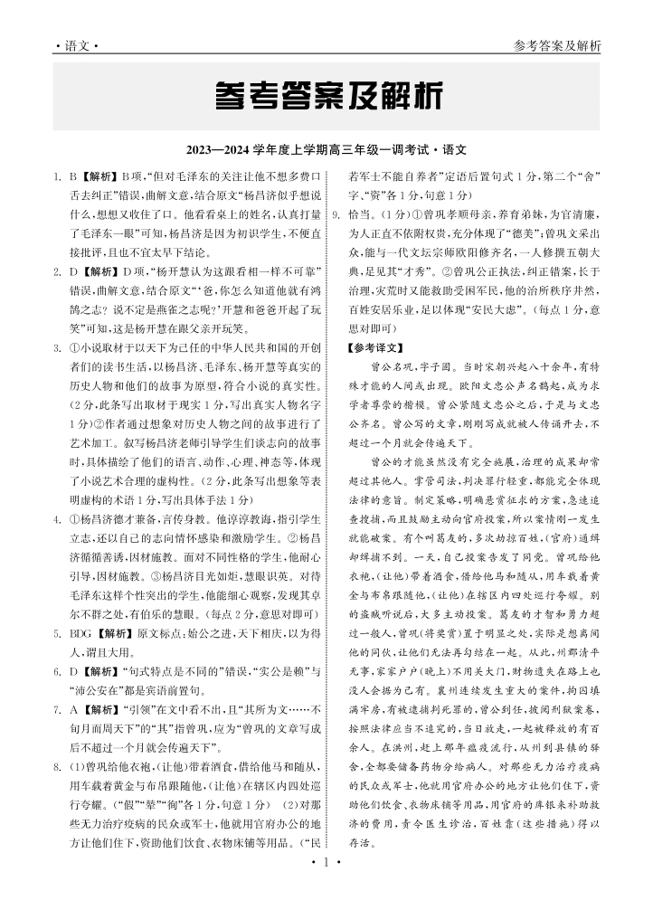 河北省石家庄市部分学校2023-2024学年高三上学期一调考试 语文答案