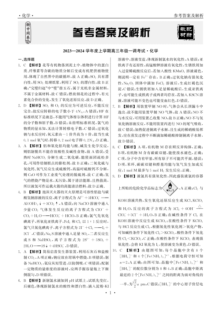 河北省石家庄市部分学校2023-2024学年高三上学期一调考试 化学答案