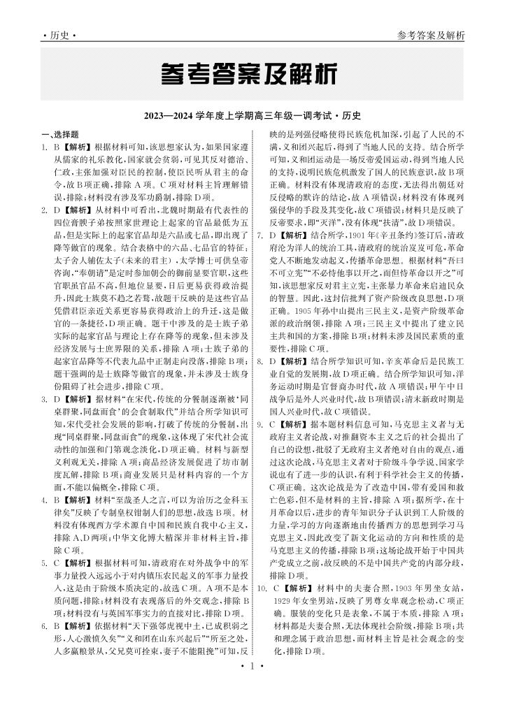 河北省石家庄市部分学校2023-2024学年高三上学期一调考试 历史答案