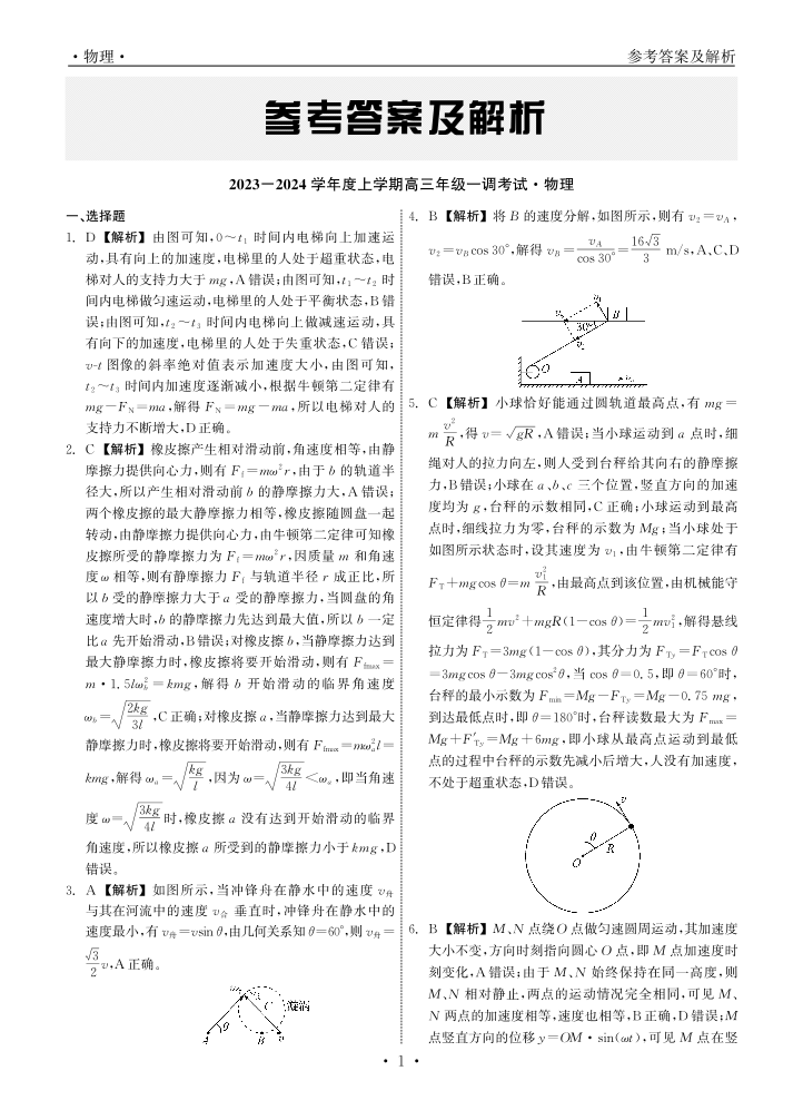 河北省石家庄市部分学校2023-2024学年高三上学期一调考试 物理答案