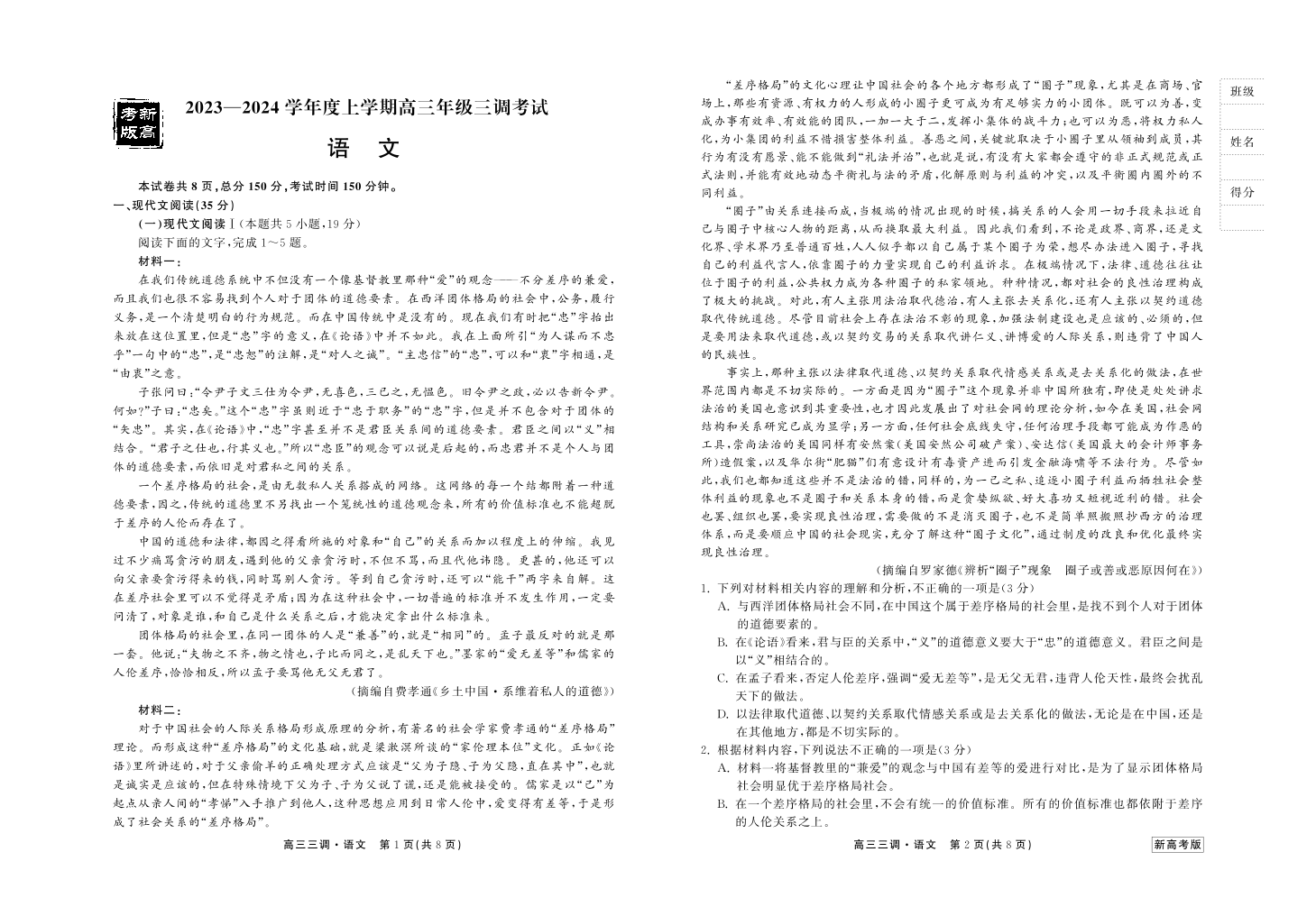 衡中同卷2023-2024学年度上学期高三年级三调考试 语文