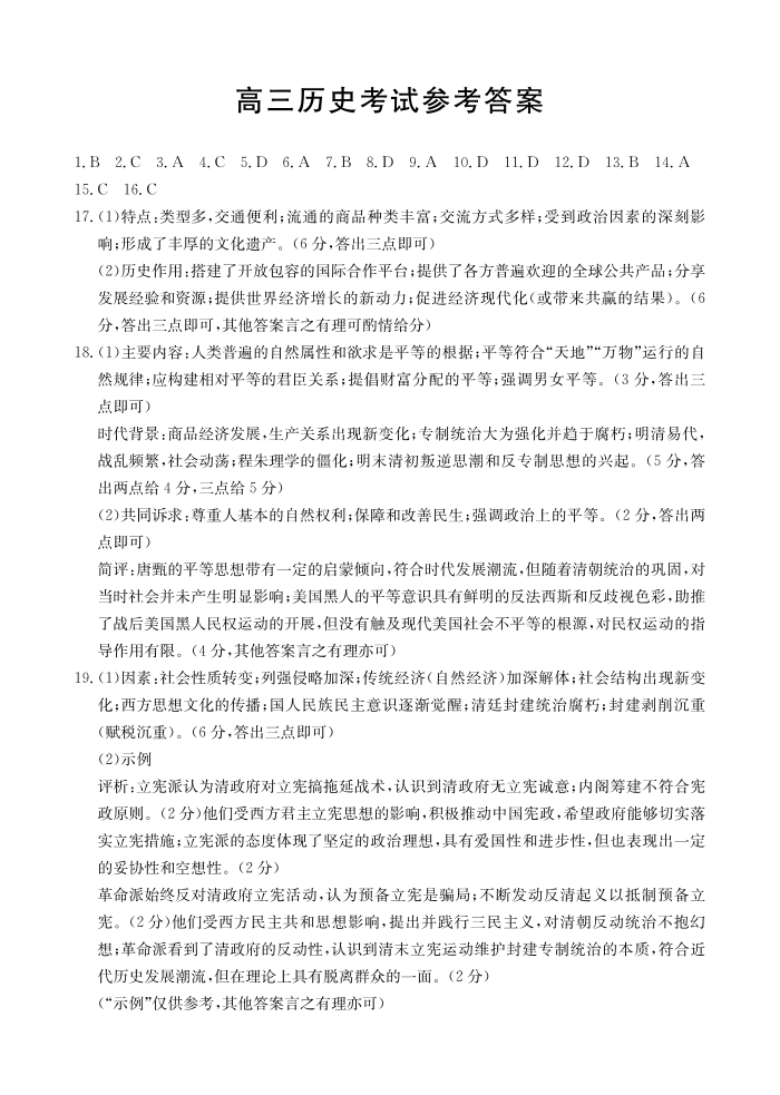 河北省保定市部分高中2023-2024学年高三上学期10月联考 历史答案