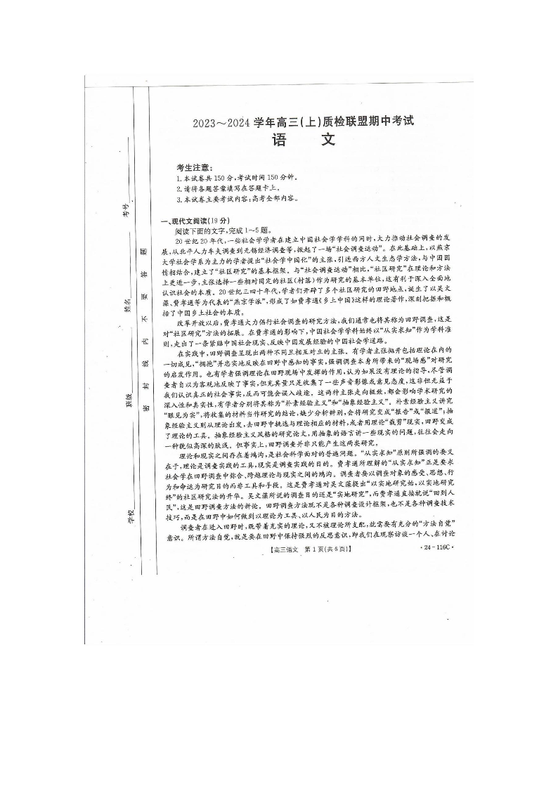 河北省邢台市四校质检联盟2023-2024学年高三上学期期中考试 语文