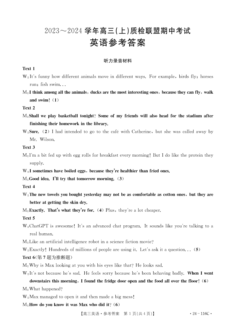 河北省邢台市四校质检联盟2023-2024学年高三上学期期中考试 英语答案