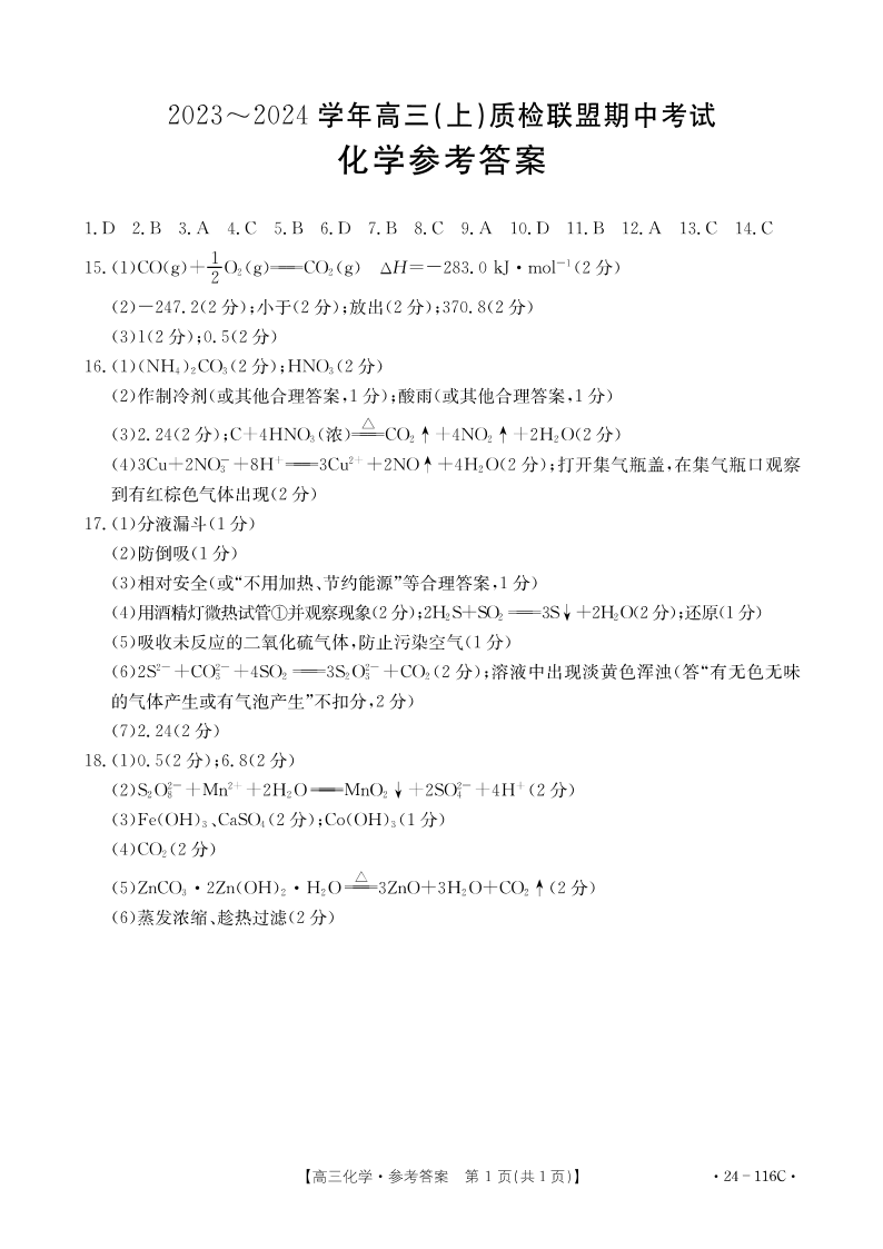 河北省邢台市四校质检联盟2023-2024学年高三上学期期中考试 化学答案
