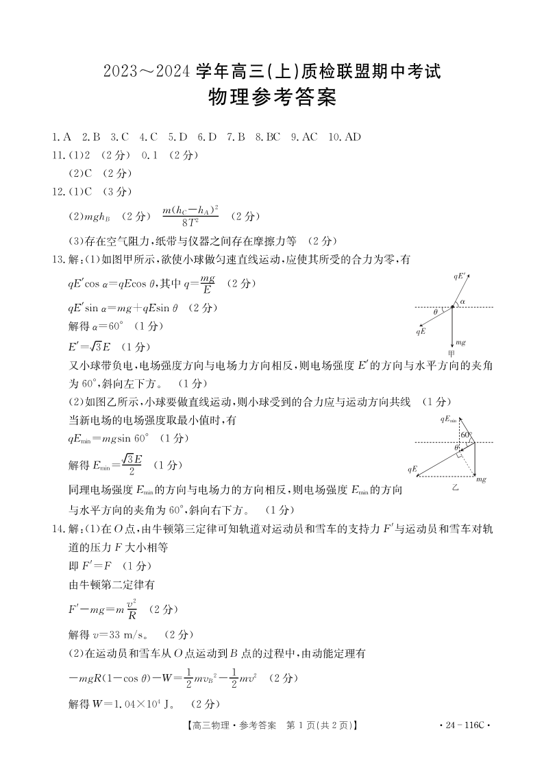 河北省邢台市四校质检联盟2023-2024学年高三上学期期中考试 物理答案