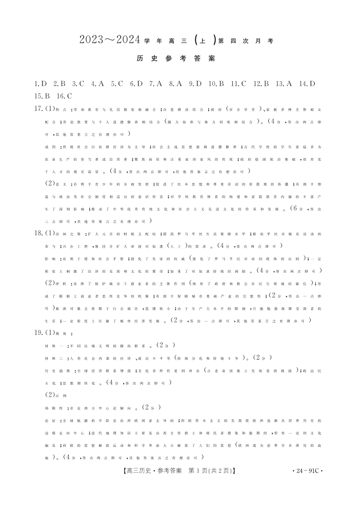 河北省邢台市五岳联盟2023-2024学年高三上学期第四次月考 历史答案
