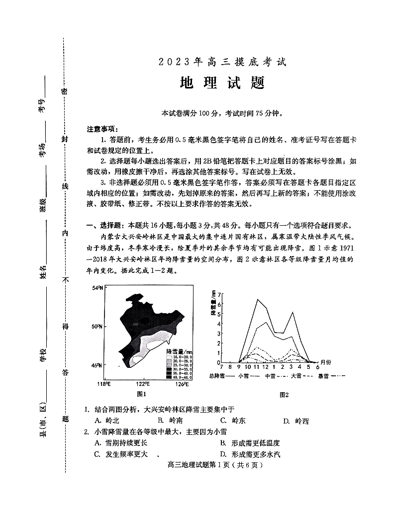 河北省保定市2023-2024学年高三上学期10月摸底考试(期中)地理