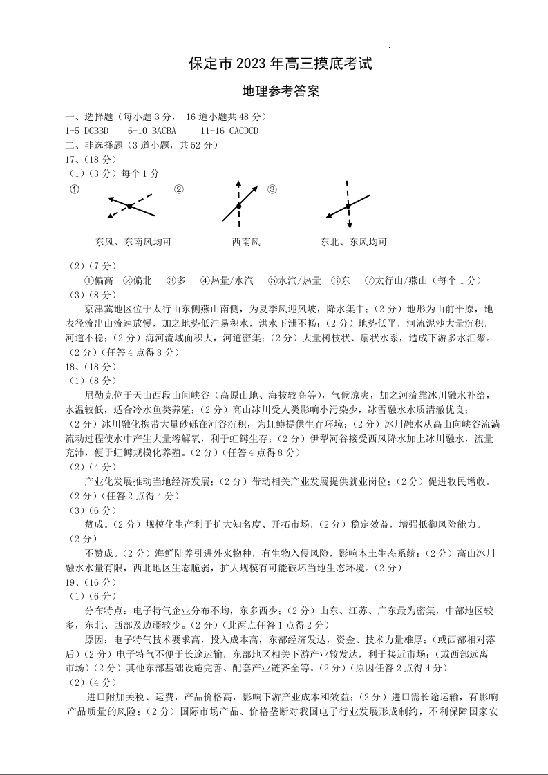 河北省保定市2023-2024学年高三上学期10月摸底考试(期中)地理答案