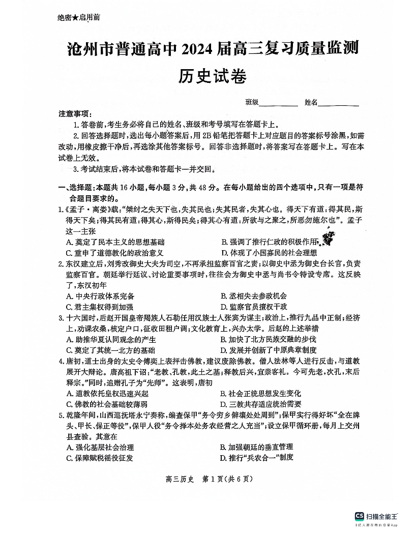 河北省沧州市部分学校2023-2024学年高三上学期10月联考 历史