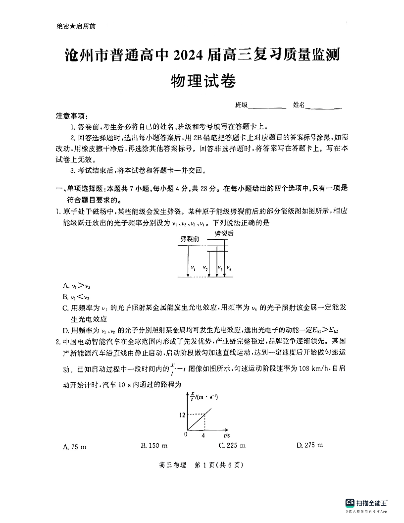 河北省沧州市部分学校2023-2024学年高三上学期10月联考 物理