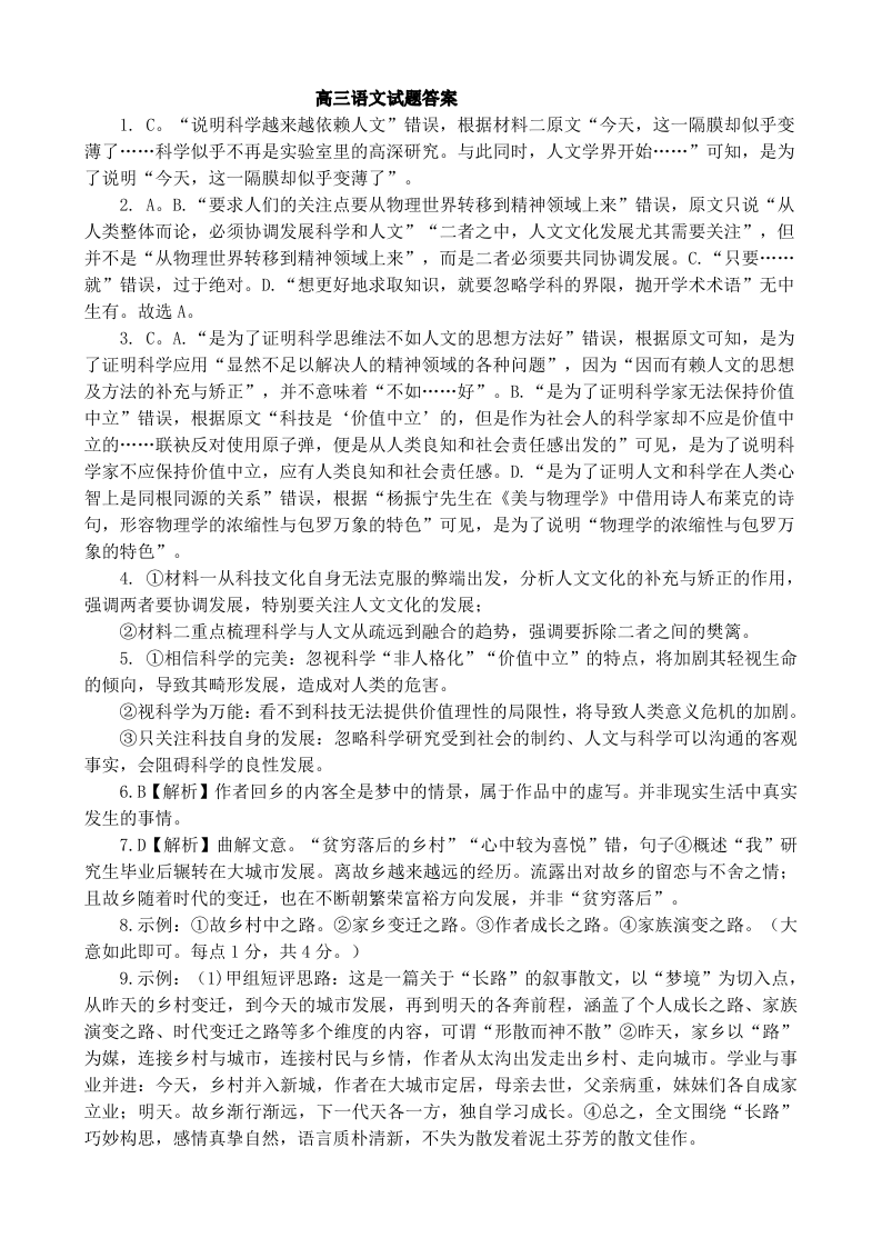河北省保定市唐县第一中学2024届高三上学期10月月考 语文答案
