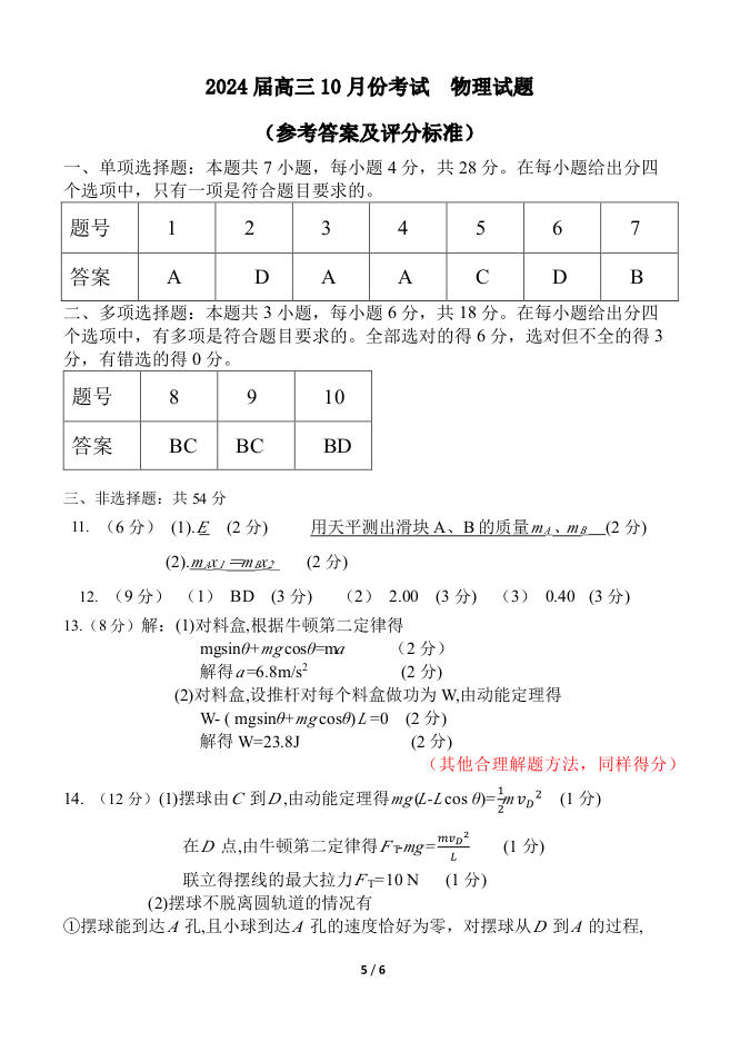 河北省保定市唐县第一中学2024届高三上学期10月月考 物理答案