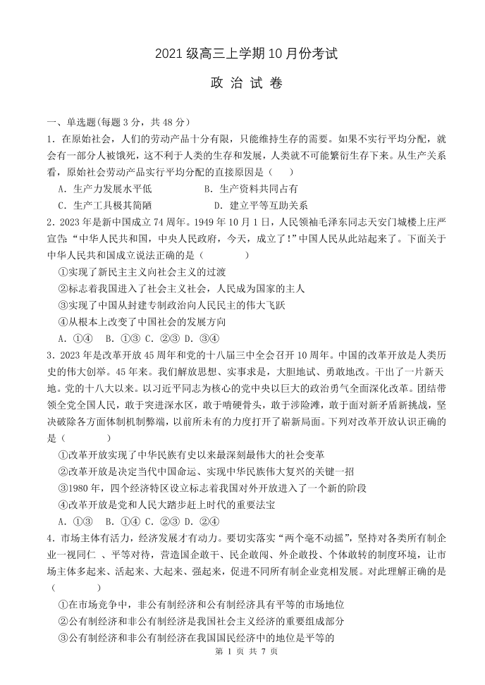河北省保定市唐县第一中学2024届高三上学期10月月考 政治