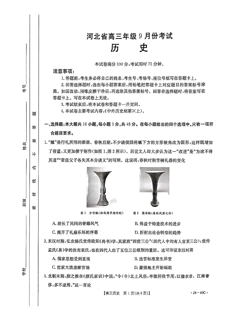 河北省保定市部分高中2023-2024学年高三上学期9月月考 历史试题