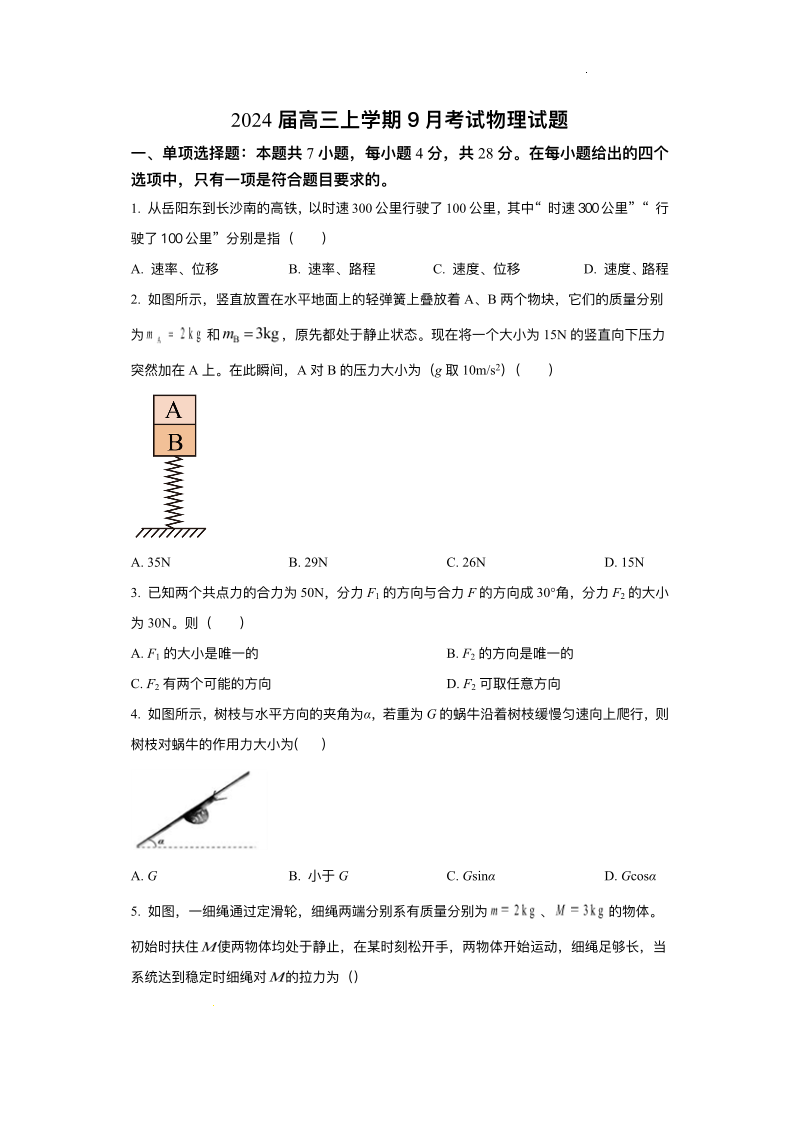 河北省保定市部分高中2023-2024学年高三上学期9月月考 物理试题