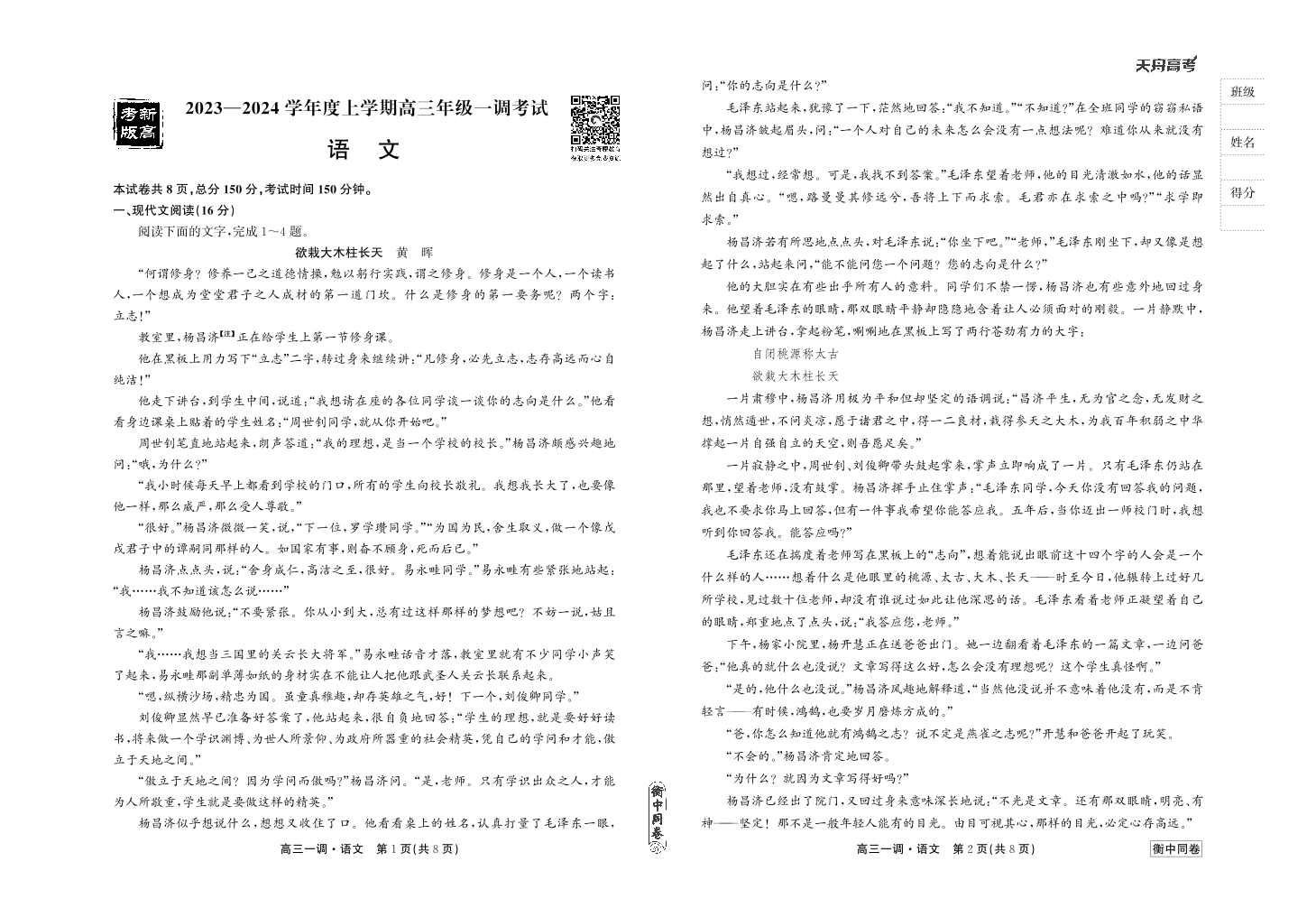 衡中同卷2023-2024学年度上学期高三年级一调考试 语文