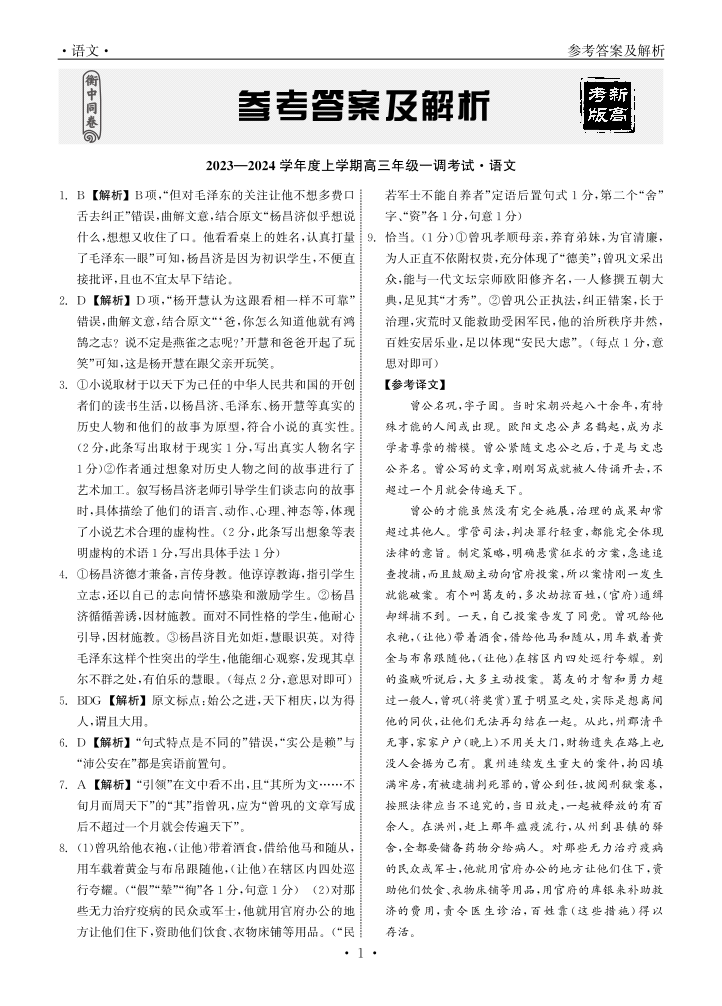 衡中同卷2023-2024学年度上学期高三年级一调考试 语文答案