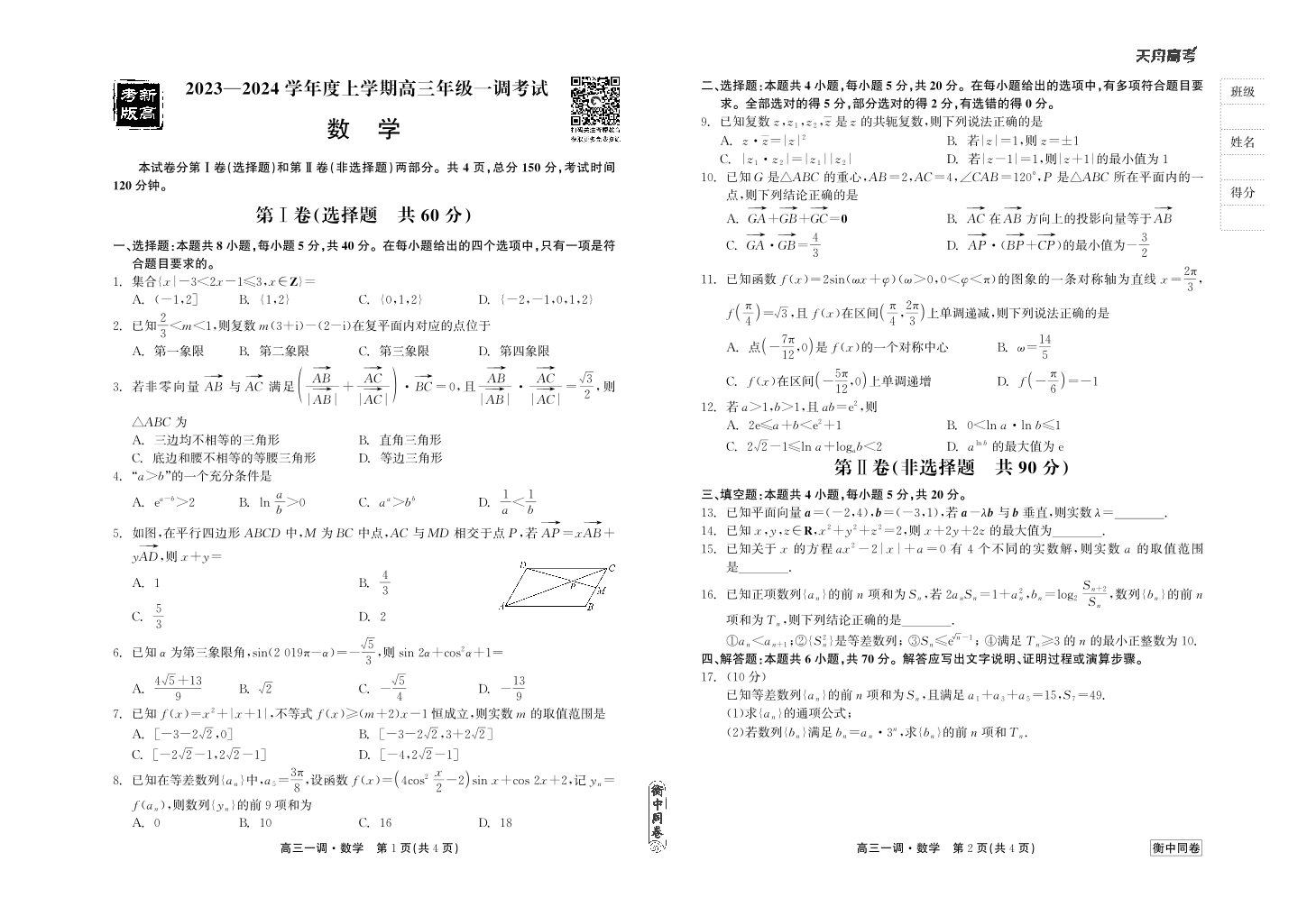 衡中同卷2023-2024学年度上学期高三年级一调考试 数学