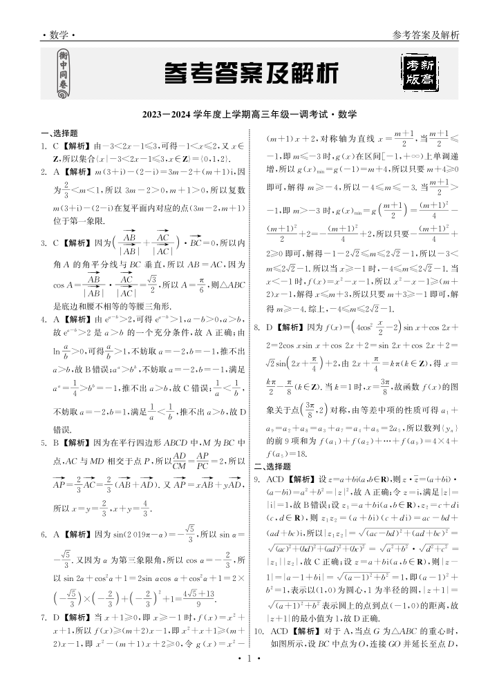 衡中同卷2023-2024学年度上学期高三年级一调考试 数学答案