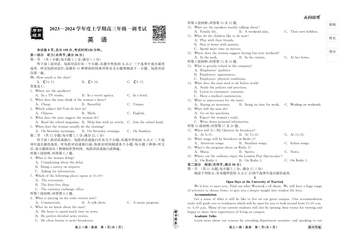 衡中同卷2023-2024学年度上学期高三年级一调考试 英语