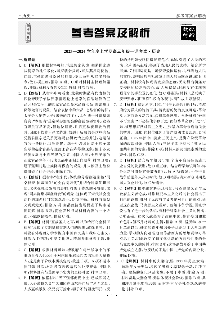 衡中同卷2023-2024学年度上学期高三年级一调考试 历史答案